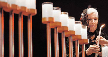米ニューヨークのユダヤ人遺産博物館で15日に行なわれたホロコースト犠牲者追慕の行事で、あるホロコーストの生存者がろうそくに火をつける。