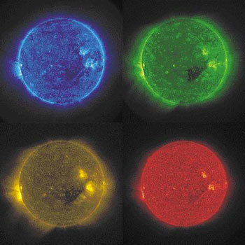 米国航空宇宙局(NASA)が23日、初めて撮影した太陽の3次元イメージを公開した。昨年10月に打ち上げられ、一つは地球の前で、もう一つは地球の裏側で太陽を回るふたつの探査船「ステレオ(STEREO)」が撮影したものを合成した写真で、特殊めがねをかけて見ると立体的に見える。上のラインの左から時計回りにそれぞれ摂氏100万度、150万度、6万〜8万度、20万度の時の太陽の様子だ。