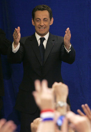 6日、ニコラ・サルコジ候補のフランス大統領当選が確定した直後、サルコジ当選者がパリのサル・ガボ劇場に集まった支持者らの前に出て、明るい笑顔を見せながら、両手をあげて歓呼に答える。
