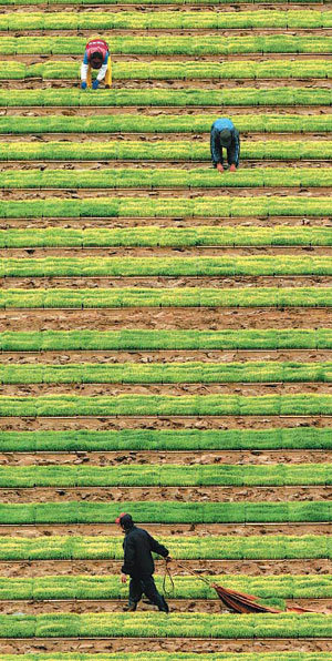 農業を行う農民たちには本格的な農業のシーズンが始まった。田植えのシーズンに入った9日、慶尚北道聞慶市虎渓面(キョンサンプクド・ムンギョンシ・ホゲミョン)の野辺で、この村の住民たちが苗代で育てた苗を田植え機で田に植え替るために苗床を移している。