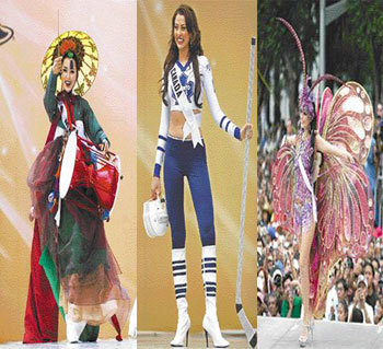 メキシコの首都メキシコシティで開かれた2007年ミス・ユニバース選抜大会に参加した世界各国の美女たちが20日、伝統衣装の美しさを披露した。「ファン・ジニ」流の妓女服を着たミス・コリアの李ハニ(左)のチャングの舞踊が軽快だ。ミス・カナダのスカヤ(中央)氏は、アイスホッケーの競技服を身につけ、ミス・ブラジルのキマランイス氏は、カーニバルに登場しそうな蝶の服を披露した。ミス・ユニバース大会の本選は28日(現地時間)開かれる。