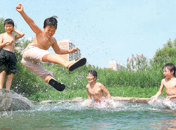 5月の最後の休日の27日、全国的に昼の気温が30度近くに上がる猛暑だった。ソウル地域は同日、昼の最高気温が30.1度で、今年に入って最も高い気温を記録した。同日、ソウル江南区良才川(カンナムグ・ヤンジェチョン)を訪れた子供たちが涼しそうに水遊びを楽しんでいる。