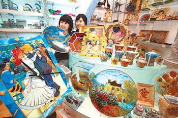 ソウル中区忠武路(チュング・チュンムロ)の新世界(シンセゲ)百貨店・インテリア商品の売り場で5日、買い物客がモネ、クリムトなど有名作家の作品のはめこまれた額縁、うつわ、おぼん、時計などインテリア関連商品を見る。これらの商品は、わが家に品格をもたらすインテリアだ。