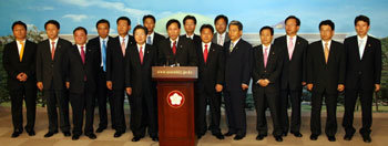 禹相虎(ウ・サンホ)ヨルリンウリ党議員(真ん中)など初・再選議員16人が8日、国会で、民主改革勢力大統合を名分で脱党を宣言した後、記者会見をしている。