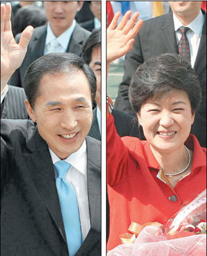 朴槿惠(パク・グンヘ)ハンナラ党前代表が11日、第17代大統領選でハンナラ党の大統領候補者選挙に出馬を宣言するため、ソウル鹽倉洞(ヨムチャンドン)党本部に到着し、支持者らに手を振っている。