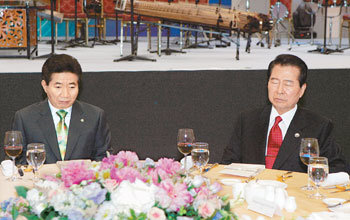 昨年6月、光州(クァンジュ)にある金大中(キム・デジュン)コンベンションセンターで開かれた「ノーベル平和賞受賞者首脳会議」の午餐の席に一緒に参加した盧武鉉(ノ・ムヒョン)大統領と金大中前大統領。