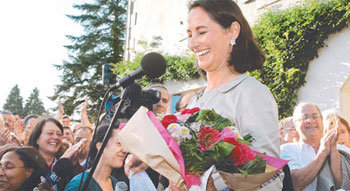 5月に行われたフランス大統領選で社会党候補だったロワイヤル氏が、総選挙が終わった17日、フランス中部のメルで大きな花束を受けて、明るい笑顔を見せる。