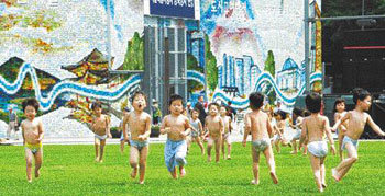 20日、ソウル市役所前の噴水で遊んでいた子供たちが、濡れた体を乾かそうと芝生の上を走り回っている。