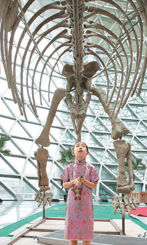 中国の少女、「わ〜。恐竜って本当に大きいなあ。」。ある中国人の少女が22日、上海の科学技術博物館で展示された実物大の恐竜の化石の模型を不思議な表情で眺めている。今回に展示される24の恐竜の化石は、ほとんど中国で一般に公開されたことのないものだ。