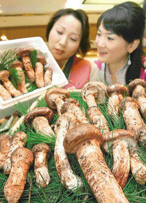 17日、ソウル中区小公洞(チュング・ソゴンドン)のロッテ・デパート本店の地下1階の「名食品館」を訪れた客が、慶尚北道盈鄹(キョンサンブクド・ヨンドク)で今年初めて出荷された松茸を見ている。価格は最上級を基準に1キロ当たり50万ウォン。