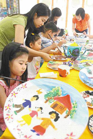 「韓国陶磁器」が23日、ソウル中区(チュンク)の清渓(チョンゲ)8街で開催した絵画イベントで、子どもたちが「夏休み」をテーマに陶磁器に絵を描いている。韓国陶磁器は、陶磁器を釜で焼いて、子どもたちに送る予定だ。
