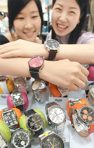 24日ソウル中区忠武路(チュング・チュンムロ)の新世界(シンセケ)デパート本店のギャラリアクラックで、従業員たちがユニセックス風の女性向けファッション時計を披露。最近流行の女性用時計は、小さくかわいいデザインから脱し、男性用のように大きく重いのが特徴だ。価格は15万〜35万ウォン。