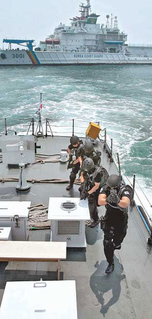 부산해양경찰은 26일 해상 테러에 대한 경각심을 불러일으키기 위해 부산항 인근 해역에서 300t급 경비함을 포함한 함정 8척에 161명의 해경을 나눠 태우고 해상 종합 대 테러 훈련을 실시했다. 특공대원들이 함정 위에서 인질 구출작전을 수행하고 있다.