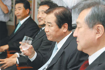 反ハンナラ陣営の主要人物6人が1日午前、ソウル汝矣島(ヨウィド)のあるレストランで会見し、反ハンナラ陣営の統合策について話し合っている。右側から未来創造大統合民主新党(新党)の鄭大哲(チョン・デチョル)常任立党準備委員長、統合民主党・朴相千(パク・サンチョン)共同代表、孫学圭(ソン・ハッキュ)前京畿(キョンギ)道知事、新党立党準備委員会・李康来(イ・ガンレ)執行委員長。