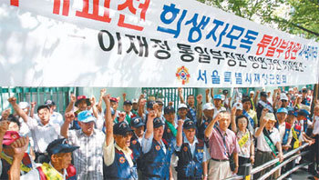 ソウル市在郷軍人会のメンバーらが17日、ソウル政府中央庁舎前で記者会見を開き、李在禎(イ・ジェジョン)統一部長官の「西海(ソヘ)交戦は反省すべき課題だ」という前日の発言を糾弾した後、李長官の辞任を促すかけ声を叫んでいる。
