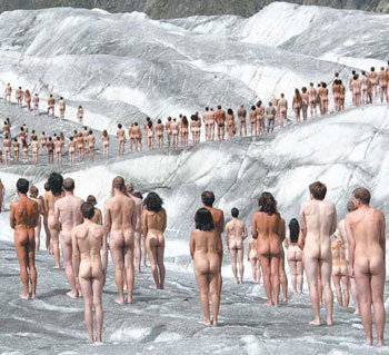 裸の男女数百人が18日、スイス・アルプス山脈のアレチ氷河で、写真撮影のためにポーズを取っている。米国の写真作家スペンサーチュニック氏が参加したこの撮影行事は国際環境団体グリーンピースが地球温暖化に対する警戒心を訴えるために企画したものだ。