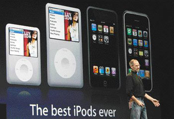 米国アップル社の最高経営者であるスティーブ・ジョブズ氏が6日、サンフランシスコで開かれた新製品の説明会で、MP3プレーヤーであるアイポッドラインの新製品「アイポッドタッチ(iPod Touch)」について説明している。無線インターネットの接続が可能なアイポッドタッチの利用者は米国のスタボックス売場から流れ出る音楽を直ちにダウンロードすることができる。アップルはまた、8GB(ギガバイト)アイホンの価格を200ドル下げるなどアイホンマーケティングも強化することにした。