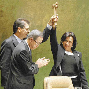 潘基文(バン・ギムン)国連事務総長(真ん中)の就任後初めて開かれる第62回国連総会が19日未明(韓国時間)、開幕した。これに先たち17日、第61回総会のハヤ・ラシド・ハリファ議長(右側)が、スルジャン・ケリム次期国連総会議長に、議事棒を渡している。