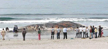 19日、メキシコ・エンセナダの海辺で、長さ22mのシロナガスクジラが波に流されて来て死んだまま発見された。メキシコ海軍兵士らが鯨を近く海岸に埋めるため移している。