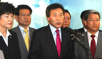 大統合民主新党の大統領選挙に向けた予備選挙候補の孫鶴圭(ソン・ハクギュ)前京畿(キョンギ)知事(中央)が21日、ソウル汝矣島(ヨイド)のキャンプで記者会見を開いて、動員選挙疑惑など旧態政治の根絶を促し、予備選挙対策本部の解体とキャンプ事務室の閉鎖方針を明らかにしている。