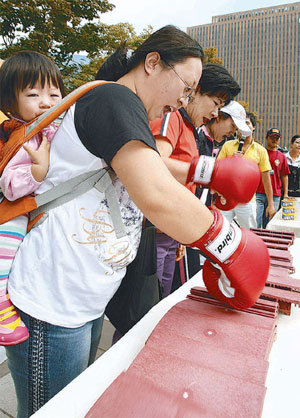 秋夕(チュソク、陰暦8月15日の節句)連休の最終日である26日午後、ソウル駅の広場で主婦たちが手にグローブをはめ、瓦の屋根を割っている。同日のイベントはある流通会社が秋夕連休の間にたまった主婦たちのストレスを解消するために用意した。