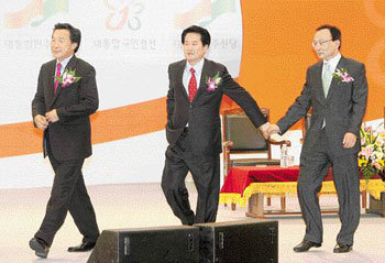 27日午後、大統合民主新党の光州・全羅南道(クァンジュ・チョルラナムド)党内選挙合同演説会が開かれた光州ヨムジュ総合体育館で、鄭東泳(チョン・ドンヨン)元ヨルリン・ウリ党議長(中央)、孫鶴圭(ソン・ハッキュ)前京畿道(キョンギド)知事(左側)、李海瓚(イ・ヘチャン)元首相が、党員らにあいさつするため、舞台の中央へ向かって歩いている。