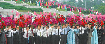 평양 시민들은 2일 오전 노무현 대통령과 북한 김영남 최고인민회의 상임위원장이 함께 오픈카를 타고 카퍼레이드를 할 때 꽃다발을 흔들며 만세 조국 통일 환영이라는 함성을 질렀다.