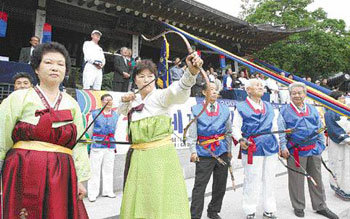 開天節(建国記念日)の3日午前、ソウル鍾路区社稷洞(ジョンノグ・サジクドン)の黄鶴亭(ファンハクチョン)で開かれた「第1回全国弓術・白日場(朝鮮時代に学業を奨励するために、全国各地から儒生を王宮の庭に集め、詩文を作らせて競わせた行事)」で、韓国伝統の衣装を着たある女性出場者が、標的に向かって弓を力いっぱい引っぱっている。