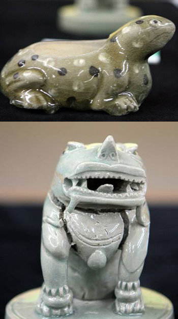 文化財庁・国立海洋遺物展示館が最近、忠鋻南道泰安郡(チュンチョンナムド・テアングン)テソムの沖合いで発掘した12世紀前半の高麗磁気・粉駙沙器・ヒキガエル模様のすずりや青磁獅子模様の香炉。12世紀当時、全羅南道康津(チョルラナムド・カンジン)を出発し、首都の開京(ケギョン)に向かう途中沈没した青磁運搬船から見つかったものだ。粉駙沙器技法で創ったヒキガエル模様のすずりは、今回が初めてだ。獅子模様の香炉は、諧謔的な表現が目立つ作品で、珍しい事例だ。8月5日から始まったテソム沖合いでの水中発掘では、これまで1万9000点余りの青磁が出た。