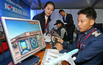 21日、京畿道城南市(キョンギド・ソンナムシ)のソウル空港のソウルエアショー展示館で開かれた「大韓航空の飛行シミュレーション大会」で、空軍士官学校生徒(写真右)が悪天候時の着陸能力など高難度の操縦技術を見せる。大韓航空がパイロット人材の底辺拡大のために開催した同大会は、民間航空機を対象に行われる国内唯一の大会だ。