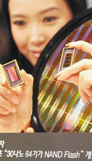 三星(サムスン)電子は23日、世界で初めて30ナノ64Gb(ギガビット)フラッシュメモリー半導体を開発したと発表した。主にデジタル・カメラ、携帯電話の貯蔵媒体に使われるこの半導体が2009年商用化されると、名刺半分大のメモリーカードにDVD映画80本、日刊新聞800年分の情報を保存することができる。また、今回の発表でメモリー半導体の集積度が2倍ずつ増加するという「黄の法則(半導体新成長論)」が8年目実現した。