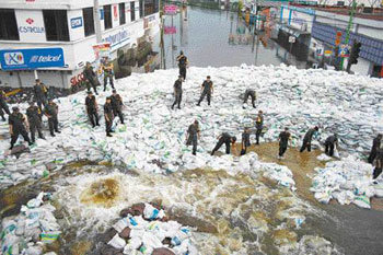 先月27日から降った雨により、メキシコ南東部タバスコ州とチアパス州が50年ぶりの大洪水に見舞われ、少なくとも1人が死亡し、およそ50万人の被災者が発生した。タバスコ州の州都ビジャエルモサで1日、兵士たちが砂袋で堤防を作っている。