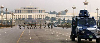 パキスタンのムシャラフ大統領が、国家非常事態を宣言した翌日の4日、軍人たちが装甲車まで動員して、イスラマバードの大統領宮殿前の道路をパトロールしている。非常事態の宣言で、憲法の効力は停止し、最高委員長や反体制人士、野党指導者たちが相次いで逮捕された。国営パキスタンテレビのほかのすべての放送が禁止された。パキスタンの政局は緊張や混沌のなかに陥っている。