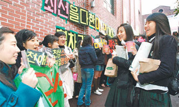 15日午前、ソウル中区明洞(チュング・ミョンドン)のケソン女子高校で大学修学能力試験(日本のセンター試験に該当)を控えた受験生たちが、後輩たちの愛嬌のある応援を見ながら明るく笑っている。
