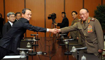 27日、平壌(ピョンヤン)の松田閣(ソンジョンガク)招待所で行われた2回目の南北国防長官会談で、金章洙(キム・ジャンス)国防部長官(写真左)と北朝鮮の金鎰迵(キム・イルチョル)人民武力部長が握手を交わしている。