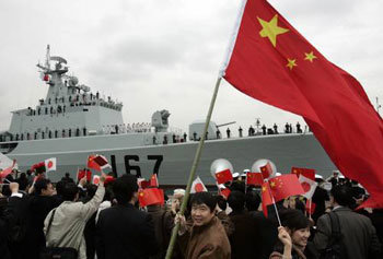 28日午前、日本東京の晴海埠頭で在日中国人数百人が中国海軍のミサイル駆逐艦「ソンジョン号」が入港すると、五星紅旗と日の丸を振りながら迎えている。中国軍の艦艇が日本に入港したのは1949年の中華人民共和国の建国以来、初めてのことだ。日本防衛省も海上自衛隊の護衛艦を中国に派遣する計画であり、両国の政府は、これをきっかけに軍事協力を増進していく方針だ。
