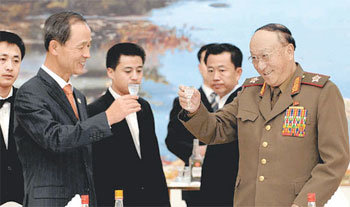 金章洙(キム・ジャンス)国防部長官(左)と北朝鮮の金鎰迵(キム・イルチョル)人民武力部長が29日、平壌(ピョンヤン)の松田閣(ソンジョンガク)で、第2回南北国防部長官会談の最後の会議に先立って開かれた昼食会の途中乾杯をしている。