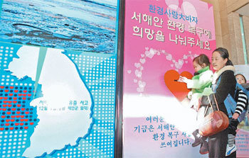 14日、ソウル中区小公洞(チュング・ソゴンドン)のロッテデパート本店の前で行われたイベント「西海(ソヘ=黄海)岸環境復旧に希望を分けてください」で、ある市民が娘の手をとって募金箱にお金を入れている。ロッテデパートが主催した同イベントは14日から16日まで行われる。