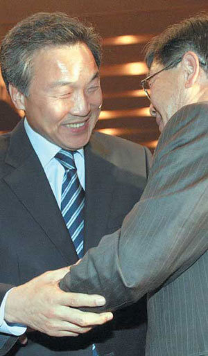 孫鶴圭(ソン・ハクキュ)前京畿道(キョンギド)知事が10日、大統合民主新党の新代表に選出された後、呉忠一(オ・チュンイル)代表を抱いて喜んでいる。