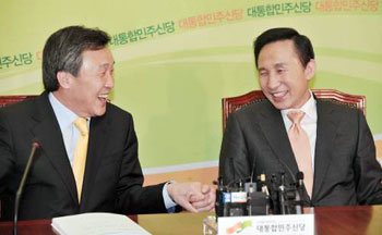 李明博(イ・ミョンバク)大統領当選者(右側)が17日、国会を訪問し、孫鶴圭(ソン・ハッキュ)大統合民主新党代表と会談し、政府組織法改正案の国会処理で協力を求めている。