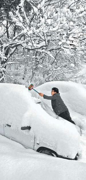 大寒の21日、大雪警報が下された江原道太白市(カンウォンド・テベクシ)のあるマンション。住民が車の上に高く積もった雪を取り除いている。同日、太白市の積雪量は午後6時現在65.1cmを記録した。