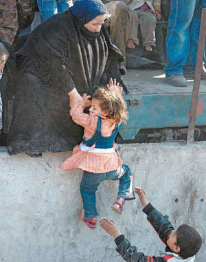 25日、パレスチナ・ガザ地区のラッパで、パレスチナ人少年が、崩れ落ちた壁を乗り越えて、下で妹を受けとめようとする。23日、パレスチナ人武装勢力がイスラエルのガザ地区への封鎖措置を避けるため、エジプトとの国境壁を爆破し、ガザ地区では生活必需品を手に入れるため、エジプトに向かう住民が後を絶たない。