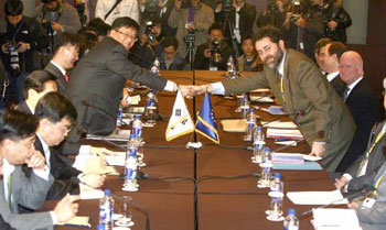 28日ソウル中区奬忠洞(チュング・チャンチュンドン)の新羅(シルラ)ホテルで、韓国—欧州連合(EU)自由貿易協定(FTA)第6回交渉に先立ち、双方の首席代表である金ハンス通商交渉本部のFTA推進団長(左)とガルシア・ベルセロEU執行委員会通商総局東アジア局長が握手を交わしている。今回の交渉は来月1日まで行われる。