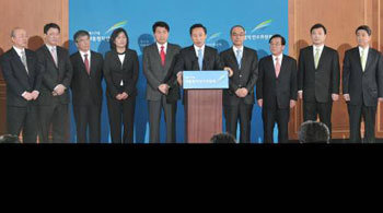李明博(イ・ミョンバク)大統領当選者が10日、ソウル鍾路区三清洞(チョンノグ・サムチョンドン)の大統領職引継ぎ委員会の大会議室で記者会見を開き、大統領首席秘書官の人選内容を発表している。左から柳佑益(ユ・ウイク)大統領室長、金炳局(キム・ビョングク)外交安保、金仲秀(キム・ジュンス)経済、朴美碩(パク・ミソン)社会政策、李周浩(イ・ジュホ)教育科学文化首席、李当選者、朴宰完(パク・ジェワン)政務、李鍾贊(イ・ジョンチャン民情、郭承俊(クァク・スンジュン)国政企画首席、李東官(イ・ドングァン)大統領府報道官。