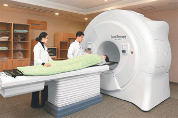 トモセラピーは放射線の強さをコントロールする治療法にCT機能を加え、呼吸など身体の微細な動きまで計算し癌の部位に正確な放射線を照射する。