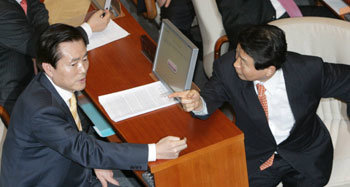 統合民主党の金孝錫(キム・ヒョソク)院内代表とハンナラ党の安商守(アン・サンス)院内代表が国会の本会議場で19日午後、前日李明博(イ・ミョンバク)大統領当選者の新政権組閣リスト発表と政府組織再編案の交渉と関連し、話し合っている。