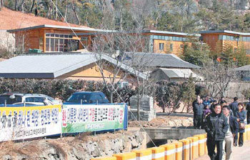 盧武鉉(ノ・ムヒョン)大統領の慶尚南道金海市進永邑(キョンサンナムド・キムヘシ・チンヨンウプ)のポンハ村の私邸前に掲げられた歓迎のプランカード。24日、盧大統領の生家と私邸の見学で1万人あまりの観光客が集まり、1日中村全体が混雑した。