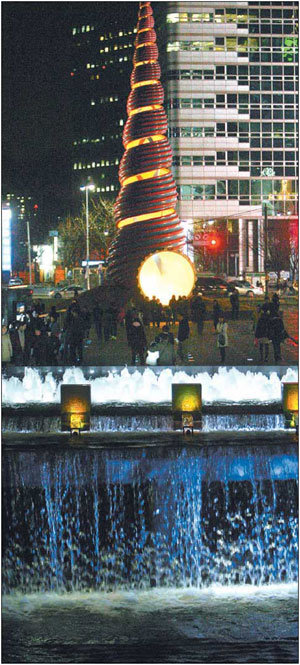 春を迎え清渓滝やトンネル噴水など清渓川(チョンゲチョン)の噴水10ヵ所が稼動を開始した。2日午後、ソウル清渓広場に集まった市民たちが週末の夕方を過ごしている。清渓川の噴水は昨年は2月17日から稼動されたが、今年は寒さのため稼動時期が少し遅くなった。