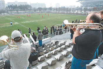 「サッカーをすればオーケストラ演奏がうまくできる?」。来韓公演を控えたロンドン・フィルハーモニック・オーケストラ団員たちが10日ソウル麻浦区上岩洞(マポク・サンアムドン)のワールドカップ競技場の補助競技場で親善サッカー大会を行った。楽器を演奏しながら応援する団員たちの姿に風変わりなものがある。ロンドン・フィルは11〜13日、ソウル世宗(セジョン)文化会館と芸術の殿堂でピアニストの白建宇(ペク・クォンウ)、ビオリストのリチャード・ヨンジェ・オーニルの協奏で舞台に立つ。