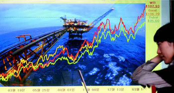 国際原油価格が、米国の追加金利引下げでドル安が続くという展望から、大幅に上昇した。10日(現地時間)、ニューヨーク商品取引所で取引きされた米原油標準油種ウエスト・テキサス・インターミディエート(WTI)は前日比1バレル=2.75ドル上がった107.9ドルで取引きを終えた。北海産ブレンド油も前日比1.78ドル上がり104.16ドルで引けた。11日、京畿道安養市(キョンギド・アンヤンシ)の韓国石油公社総合状況室で、職員たちが心配そうな顔で国際原油価格のグラフをみている。